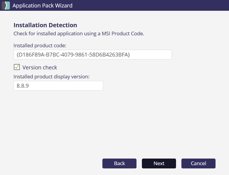 If you use the Application Pack Wizard, product name and version filters are added automatically, which will prevent the application pack from running if a current or newer version of the application is already installed on the target PC. If such filters are present and detect an existing installed version of the application on the target PC, then the pack will not install, and an error message will appear in the console: