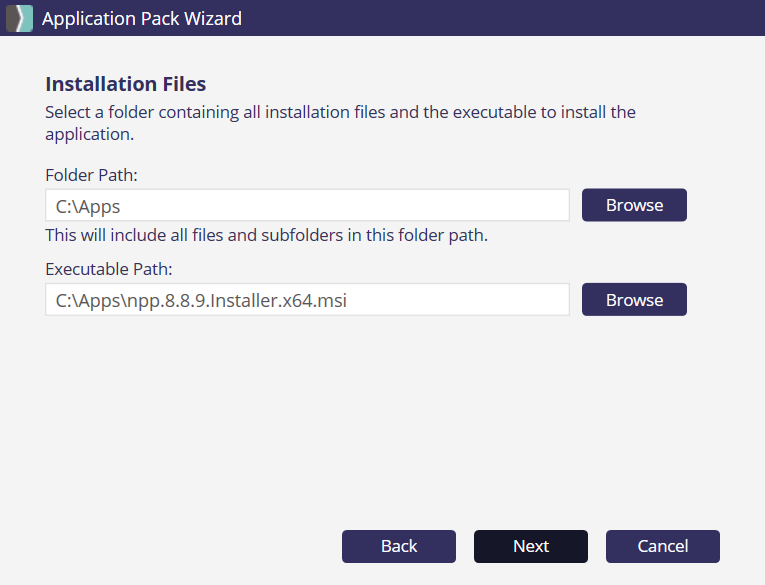Note: The Folder Path you select is presumed to contain files relating to this installation, and all files and subfolders within this path will be added to the Application Pack.