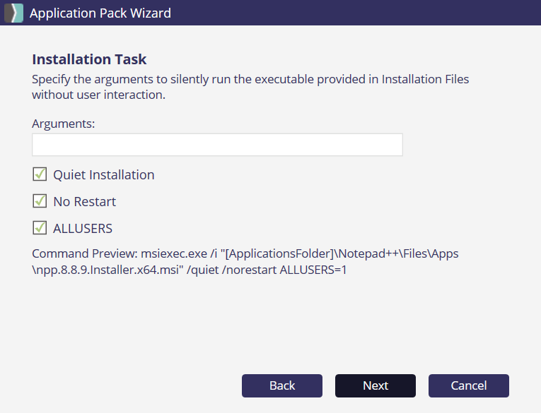 8. On the Installation Task page, specify the arguments required for a silent installation of your application, as well as any additional parameters required for your specific installation and then click Next.
