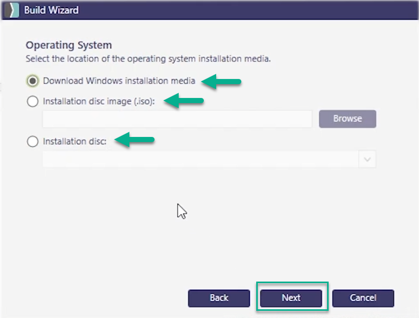 - On the Operating System page, select Download Windows installation media or provide a location for an Installation disc image (.iso) or an Installation disc. Then click Next.