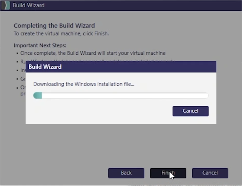- The build wizard will then begin the process of creating the Virtual Machine. You'll see some progress bars in the wizard that show processes like downloading the Windows Installation file, preparing the unattend ISO, and creating the virtual machine. There are no actions that need to take place during these steps.