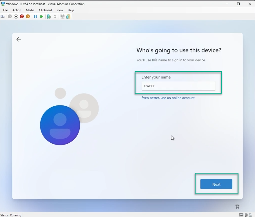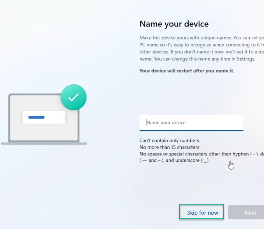 - After you have installed Windows on the virtual machine, it will ask you to Name your device. You can select Skip for now as the reference VM name will be replaced when you deploy your image to your target endpoints with SmartDeploy.