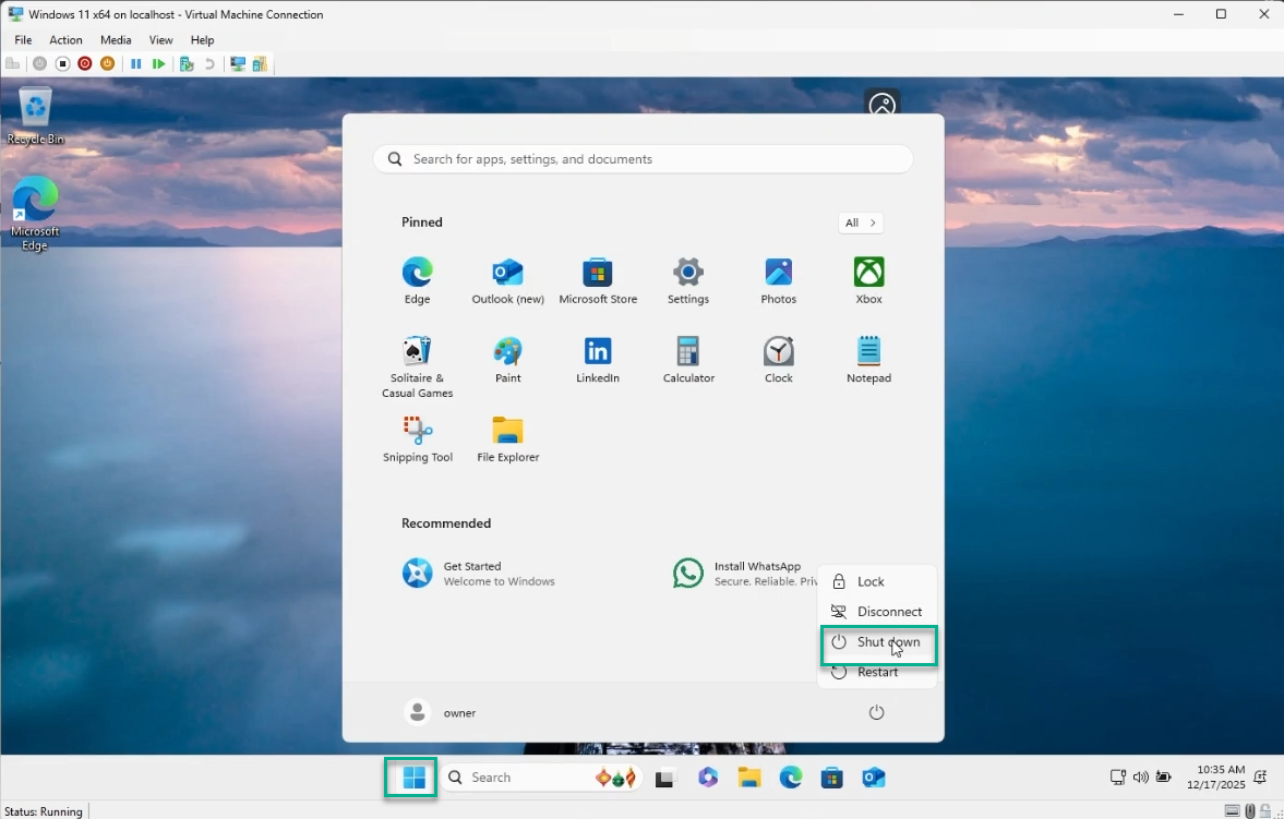 - After selecting Finish, SmartDeploy creates a configuration file, and the chosen virtualization platform should launch. The virtualization platform should be configured to use the Windows 11 media you chose during the build wizard.