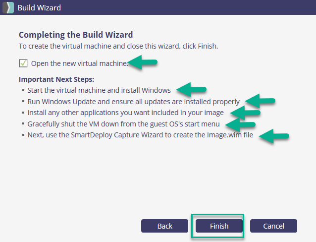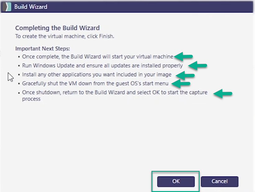 Review the Important Next Steps bullet points on the Build Wizard and, when you are ready, click OK. The Capture Wizard should launch. You can follow this guide to Capture an Image from a Virtual Disk File.