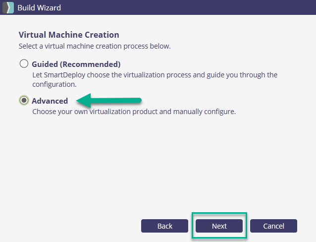 Note: This section of the article covers the Advanced Build Wizard, which creates and imports a bare-metal virtual machine (VM). Hyper-V, as shown in this video, can be created manually or you can use the Guided reference VM build wizard to create a Hyper-V virtual machine. ESX VMs must be manually created without SmartDeploy.