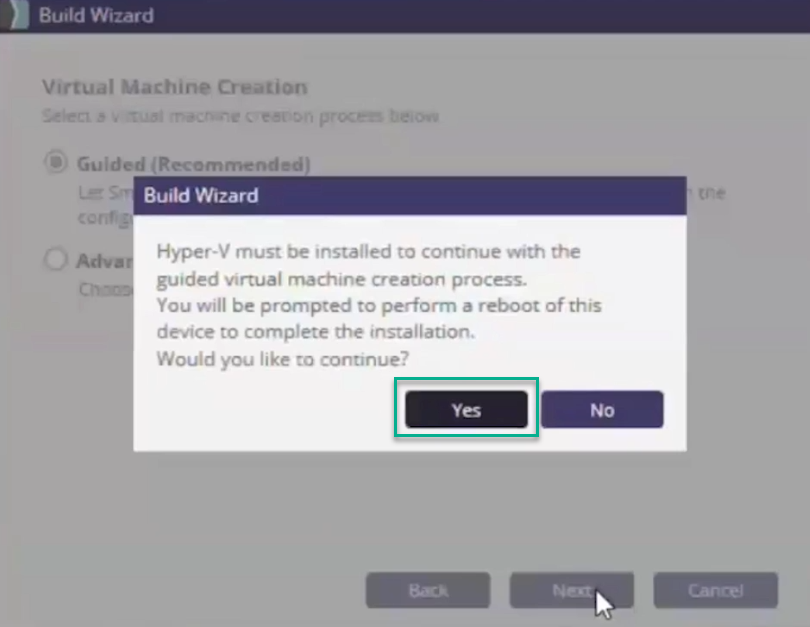 Note: If your SmartDeploy Console host system does not already have Hyper-V installed, you will get prompted with the below message regarding installing Hyper-V. Click Yes and the SmartDeploy Console host system will install Hyper-V and reboot the system. The build wizard should resume after Hyper-V is installed and the system has rebooted. - Provide a virtual machine name and location to save the virtual machine. Then click Next.