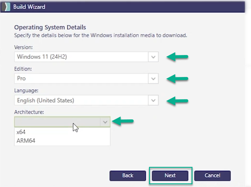 - On the Operating System Details page, make the desired selections for Version, Edition, Language, and Architecture. Then click Next.