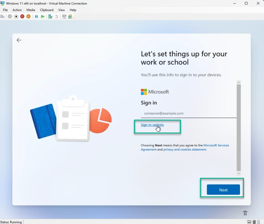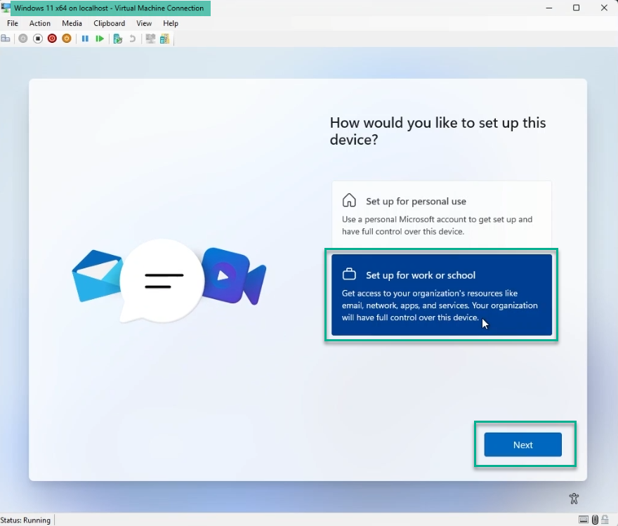 Once this process completes, the pop up disappears, and your Hyper-V reference VM will automatically start up and start installing windows. You'll want to select Set up for work or school. Then click Next. Click on sign-in options, then click Next. Enter an offline account name and password, and go through the usual security questions. Next, sign in to your VM. Install all the windows updates and any standard core applications that apply to all your target machines.
