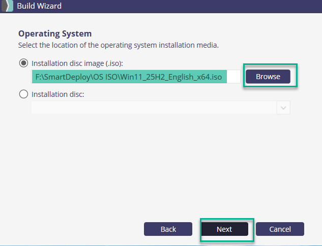 - Click Browse to select the Windows installation ISO file, or select the drive that contains the Windows installation disc, and then click Next.