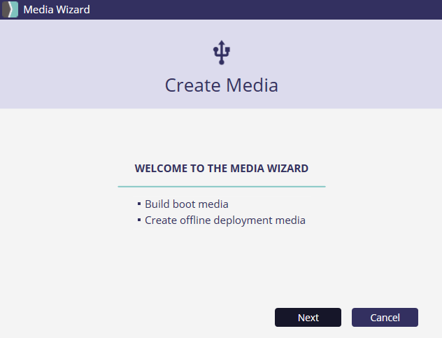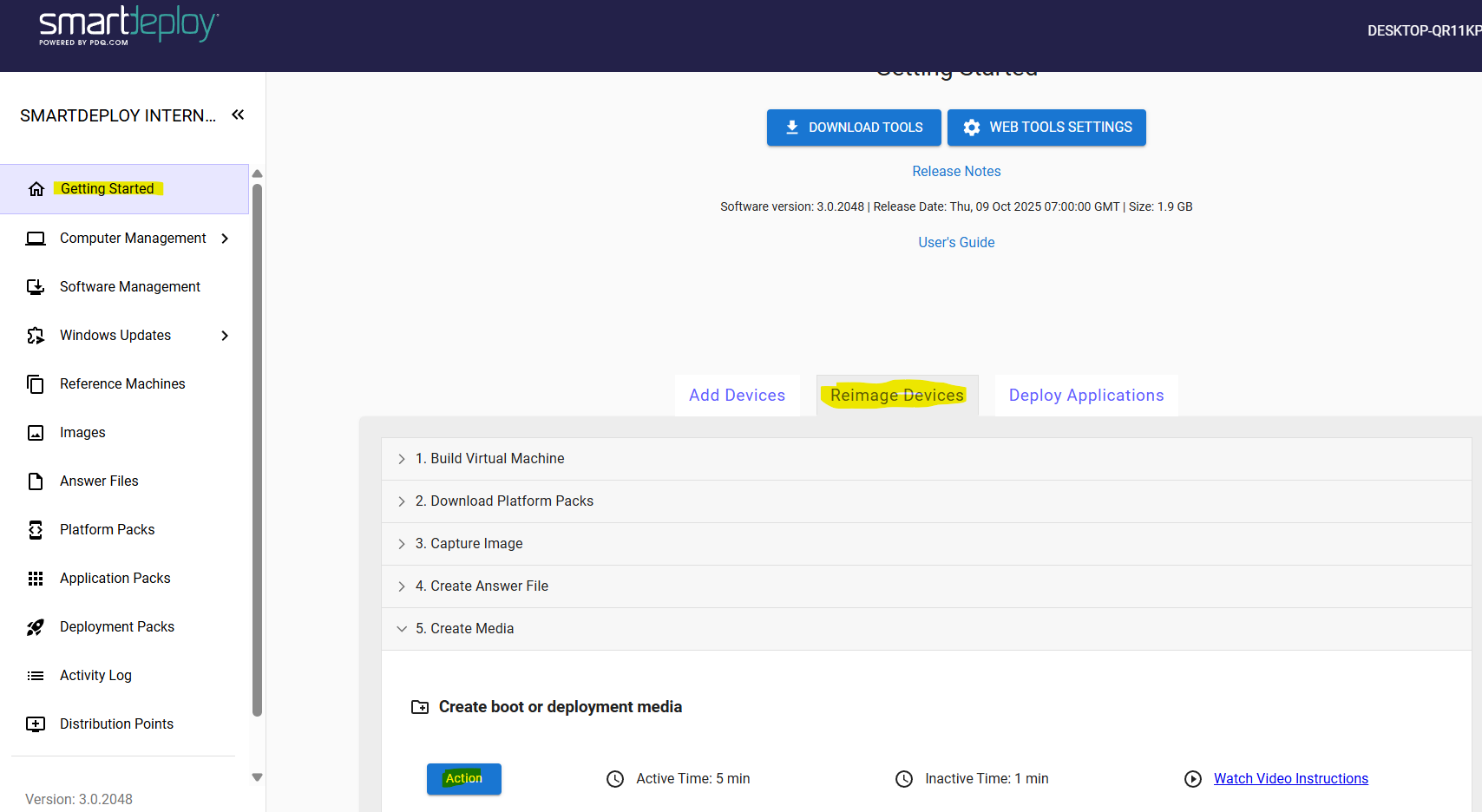 Log in to the SmartDeploy Web Console and navigate to the Getting Started page. Then click Reimage Devices - > 5. Create Media - > Action
