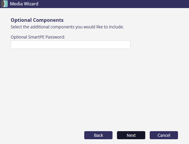 Note: The Media Wizard will automatically detect when you select a Cloud-Connected Answer File and will upload the Deployment Package to your cloud storage provider when the wizard completes. - On the Optional Components page, you can provide an Optional SmartPE Password. This is optional if you want to specify a password to prevent SmartDeploy from starting and deploying an image by an unauthorized user. Click Next.