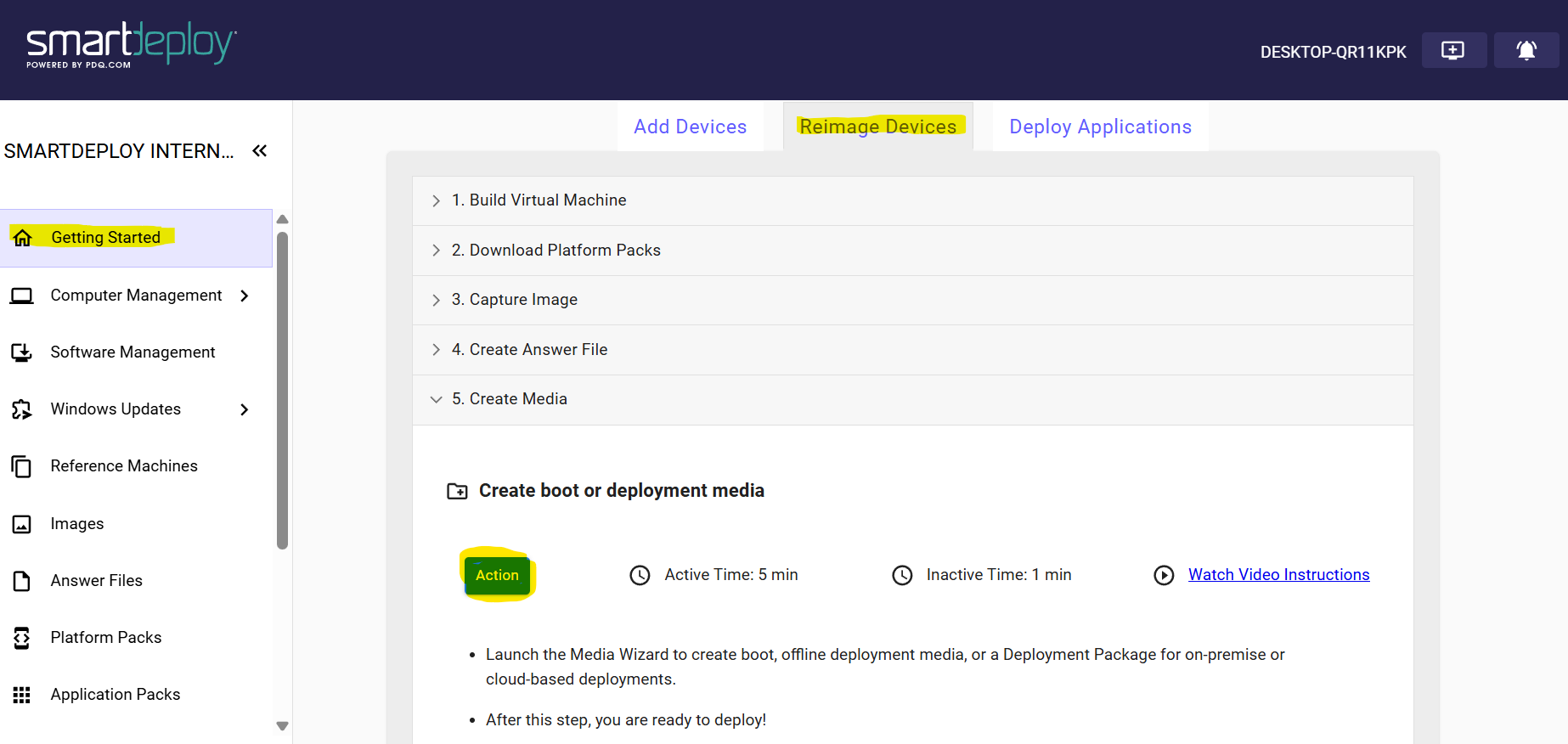 - Log in to the SmartDeploy Web Console and navigate to the Getting Started page. Then click Reimage Devices - > 5. Create Media - > Action