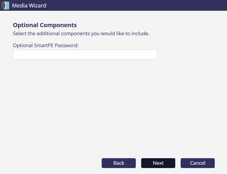 6. On the Optional Components page, you may set an Optional SmartPE Password which must be entered upon booting into SmartPE in order for deployment to proceed. Enter a password if desired, or leave blank if not, and click Next.