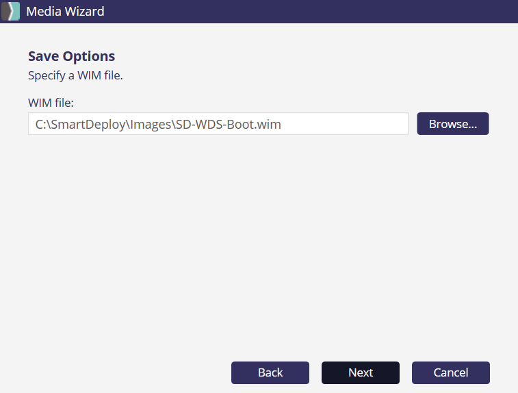 8. On the Save Options page click Browse and choose a name and location for your SmartDeploy WDS boot image. Click Save and then click Next.