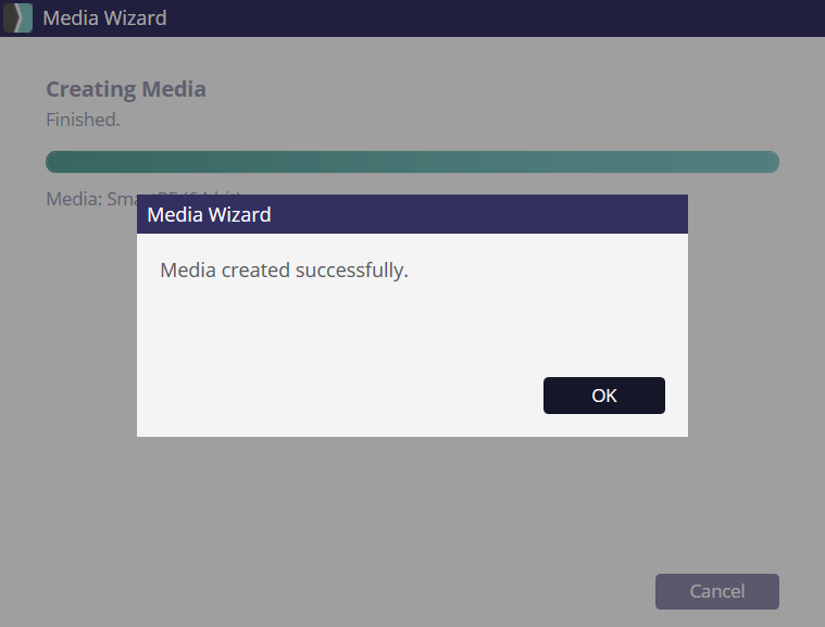 10. After the boot image is successfully created, click OK to close the Media Wizard
