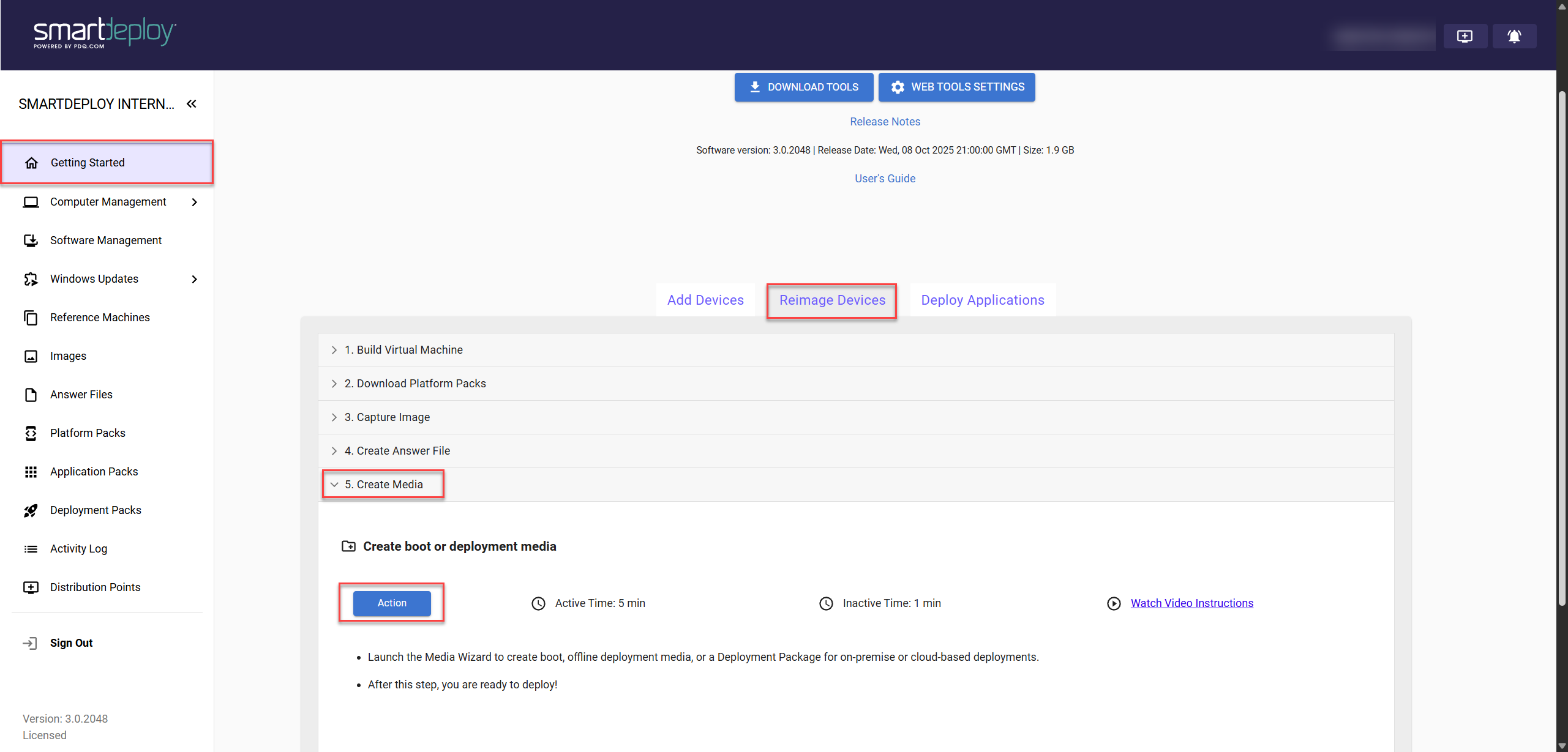 - Log in to the SmartDeploy Web Console and navigate to the Getting Started page. Then click Reimage Devices -> 5. Create Media -> Action.