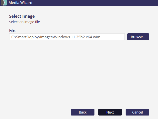 - If you are creating offline deployment media, click Browse to browse to and select your image (.wim) file, click Open, and then click Next.