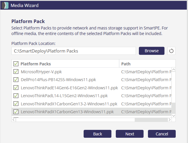 Note: By default, all Platform Packs will be selected on this page. It's important to include a Platform Pack for any model that you plan to deploy to. - On the Answer Files page, select all answer files that you wish to include.
