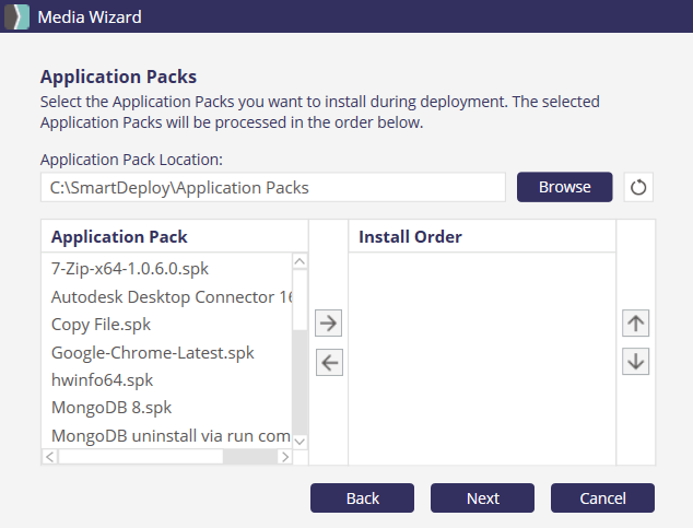 - If you are creating offline deployment media, select any Application Packs that you've downloaded or created, click the right arrow to include them in the deployment, place them in your desired order, click Next, and then click Yes to confirm. Note: See Application Packs for more detail.