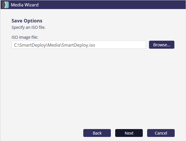 Note: 2TB ISO files can be created using SmartDeploy 3.0.1030 or newer. - On the Save Options page, choose a location to save the ISO file, and then click Next.