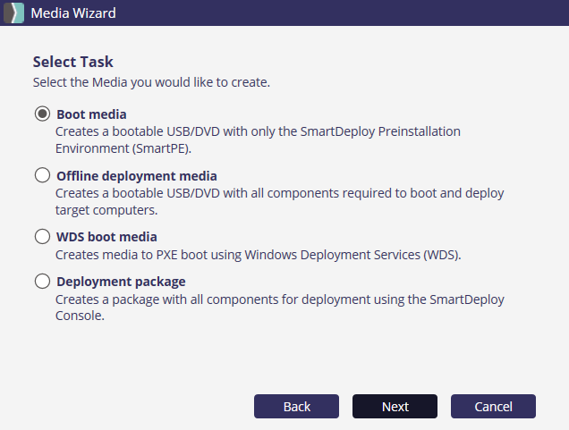 Note: If you intend to access your image, Platform Packs, and Application Packs through the network as specified in your answer file, select Boot media. If you want to deploy to a device without network access, select Offline deployment media.
