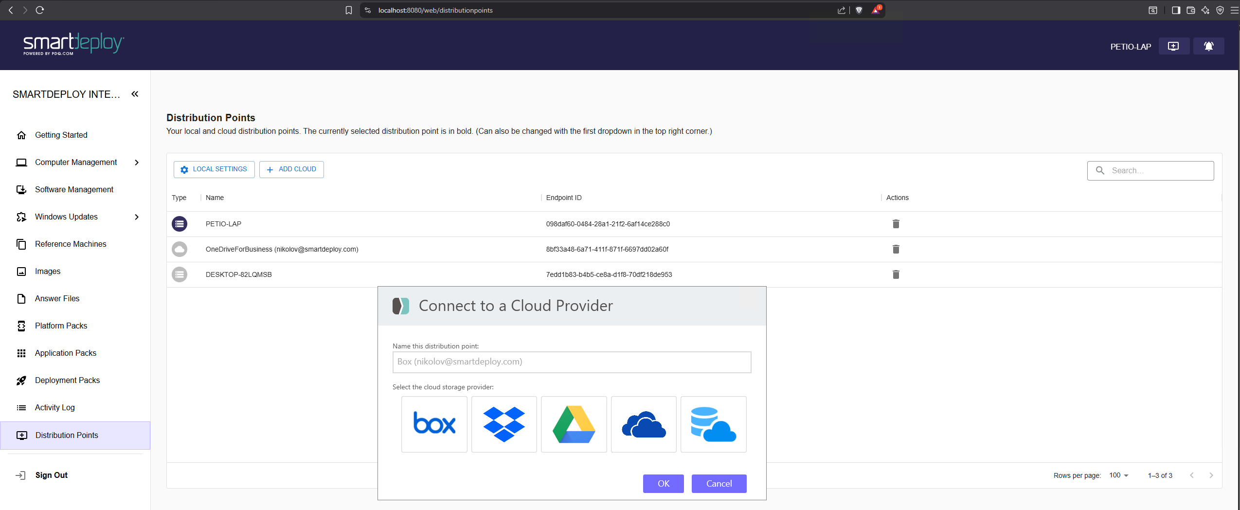 SmartDeploy can leverage your cloud storage provider for deployments to devices on and off of your local network. To use this feature, you'll need to authenticate to your provider within the SmartDeploy Console.