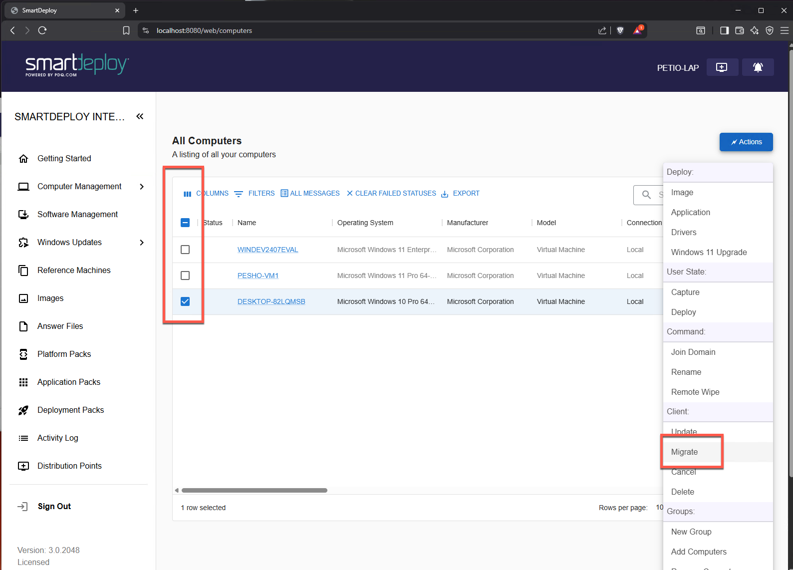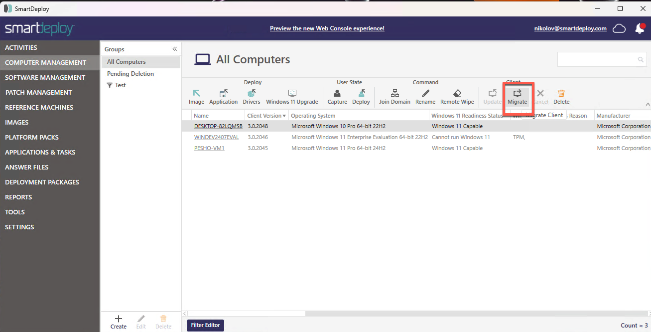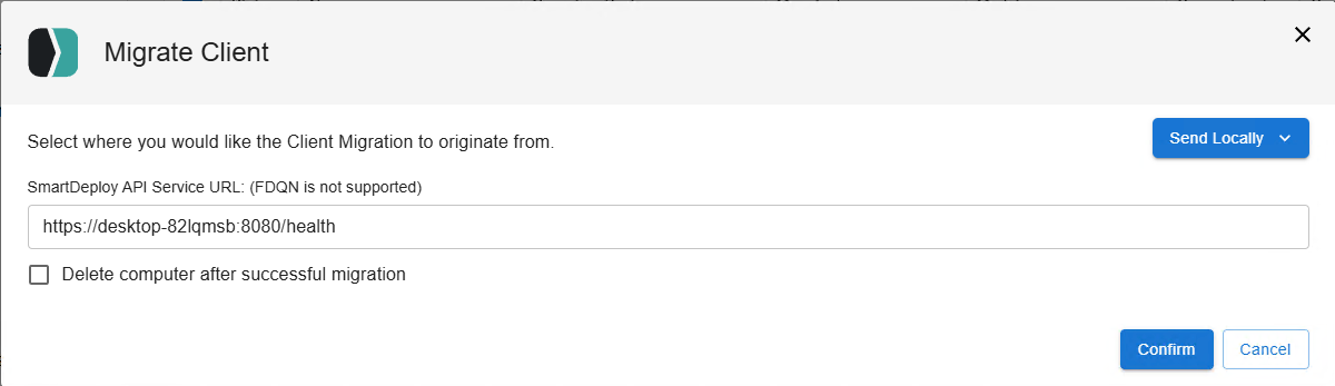 - In Computer Management select a computer you wish to migrate. Then select the migrate button. Enter the Api Service Url of the new console you want the devices migrated to.