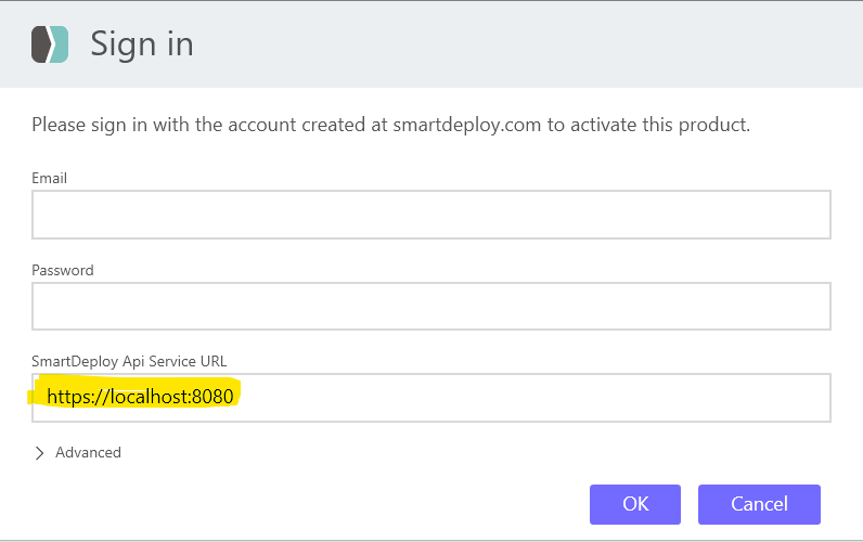 Start by installing SmartDeploy on the device that you would like to turn into a Distribution Point. When the installation completes you will be presented with this screen. Please enter the email and password that you use to log into the SmartDeploy console. Then point the SmartDeploy Api Service URL to your primary SmartDeploy server by substituting the host name of your SmartDeploy server for localhost. If the host name of your SmartDeploy server is SmrtDply-01 the SmartDeploy Api Service URL should be https://SmrtDeply-01:8080 . Once you have made that change click OK.